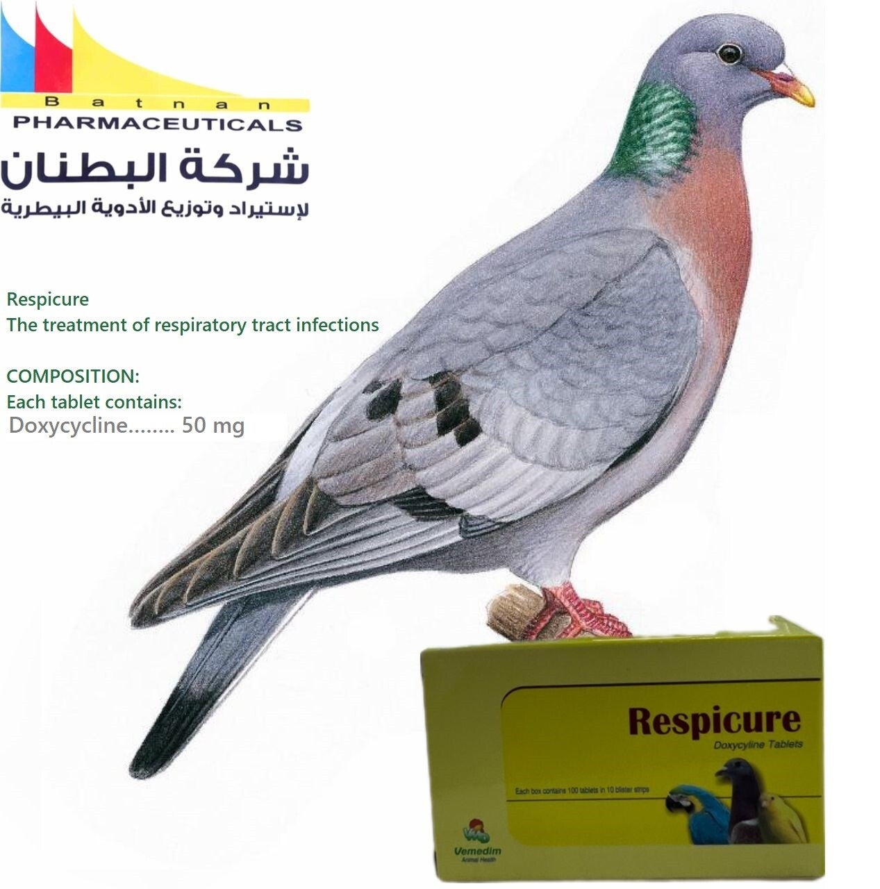 الحمام: نصف قرص (25 مجم) لكل طائر بالغ (50 مجم دوكسيسيكلين لكل 800 جم - 1 كجم من وزن الجسم) لمدة 5-7 أيام.