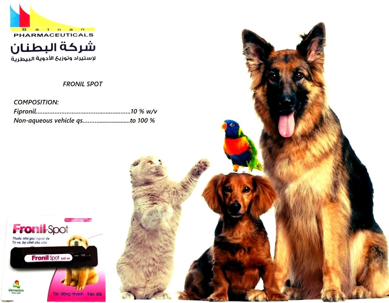 فرونيل سبوت لعلاج والوقاية من الإصابة بالبراغيث والقراد وكجزء من استراتيجية علاج التهاب الجلد التحسسي الناتج عن البراغيث، حيث تم تشخيص ذلك مسبقًا من قبل البيطري. يتحكم المنتج في الإصابة بقمل المضغ في الكلاب.