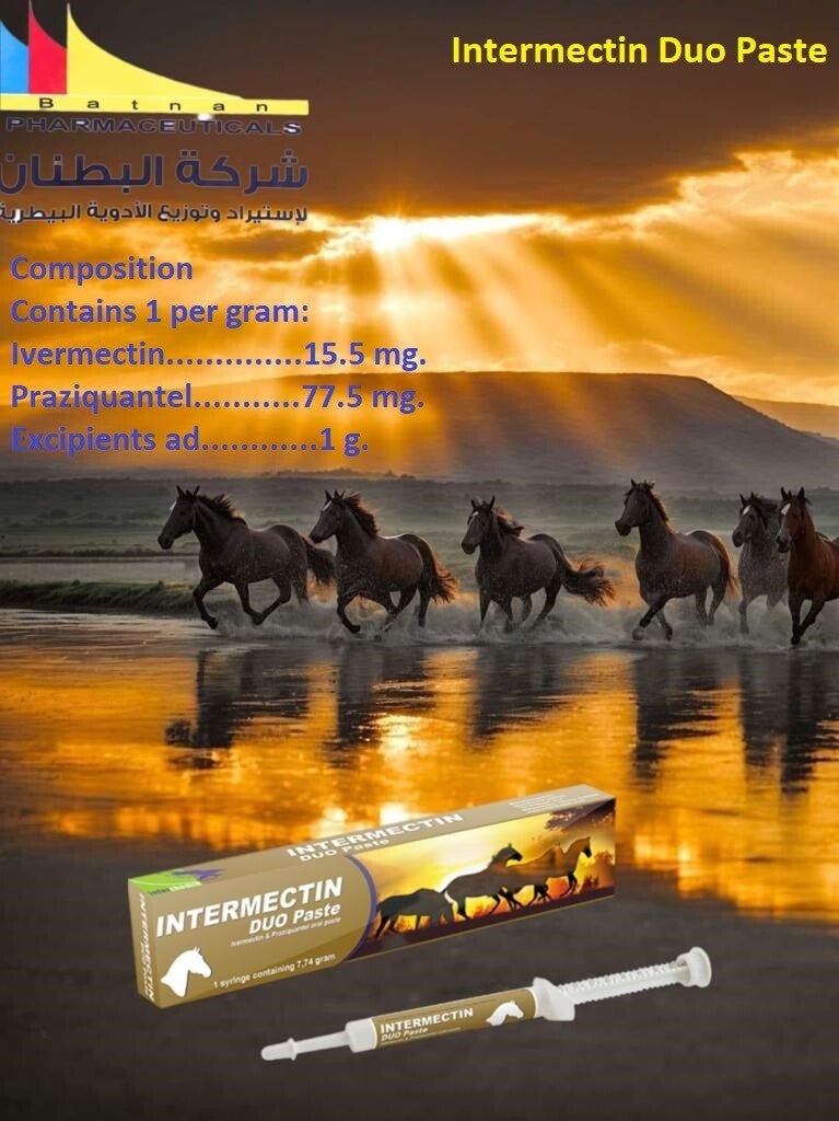 يشار إلى معجون انتيرميكتين ديو باست لعلاج الإصابة المختلطة بالديدان الخيطية والديدان الخيطية أو المفصليات في الخيول.